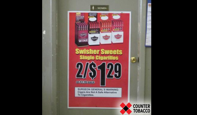 Clinton, NC. Advertising a price deal for single flavored cigarillos at a store. Photo courtesy of Counter Tobacco, http://www.countertobacco.org.