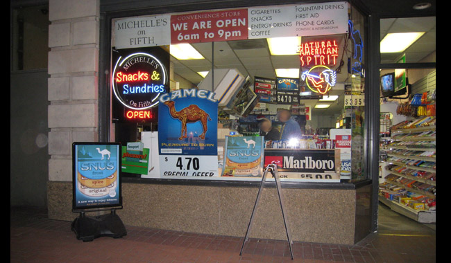Portland, OR, convenience store with ads and signs for numerous tobacco brands and products.